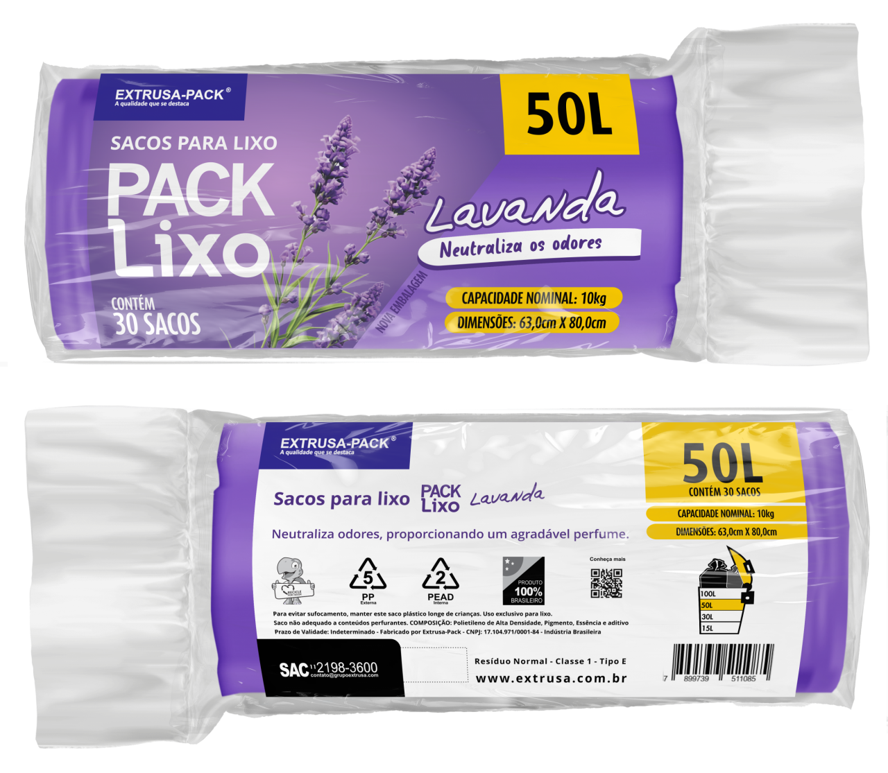 SACO DE LIXO LAVANDA 50 LITROS (63X80 CM) - FARDO COM 10 ROLOS (30 UND POR ROLO)